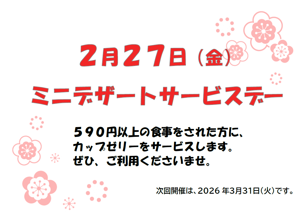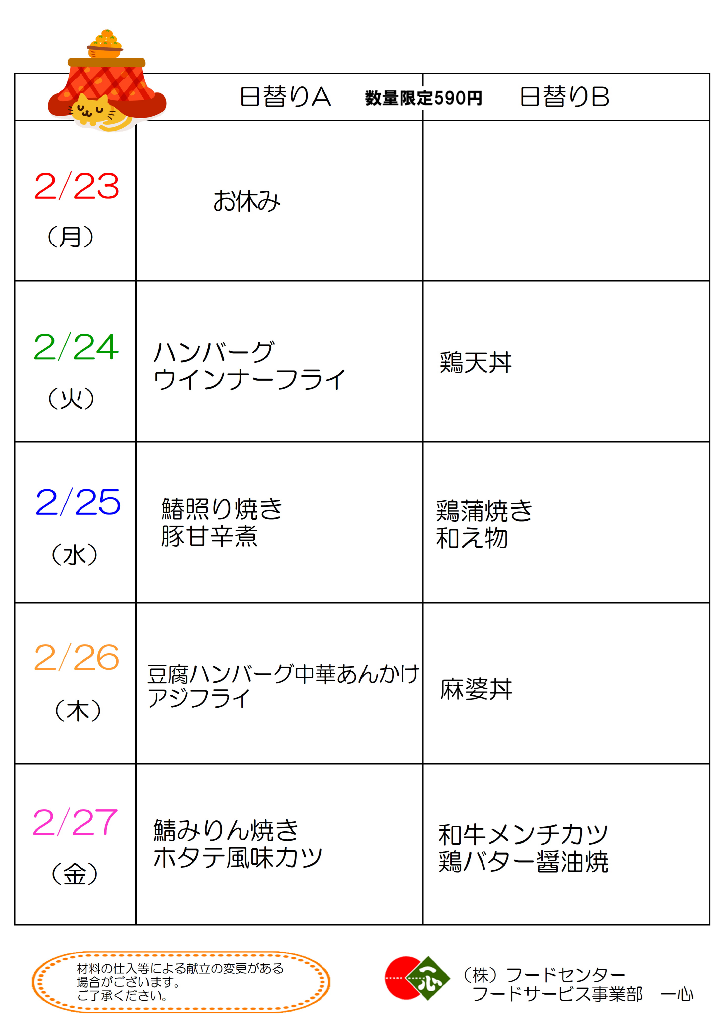 2月24日(火)~2月27日(金)日替わりランチA・Bメニュー