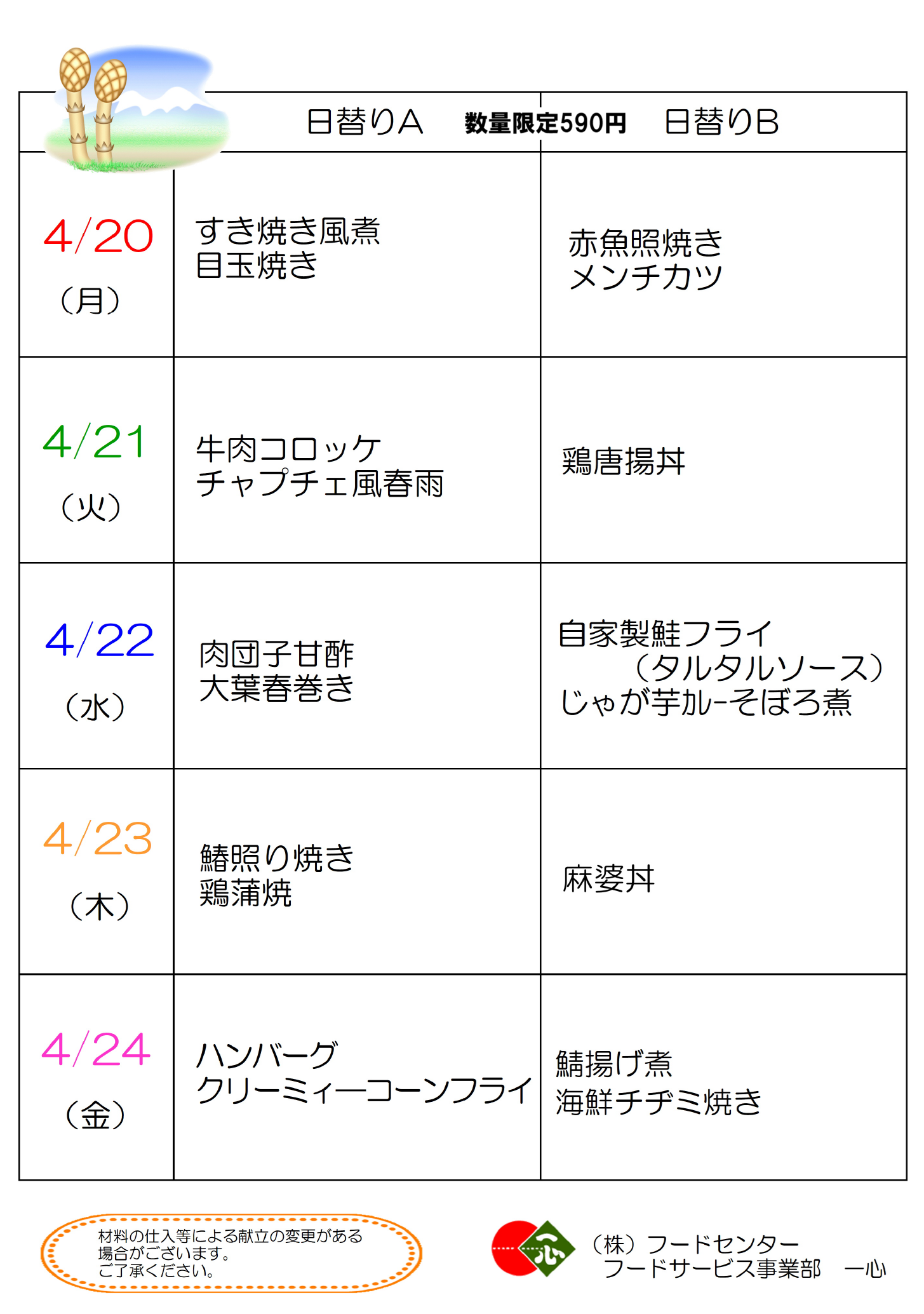 4月13日(月)~4月24日(金)日替わりランチA・Bメニュー