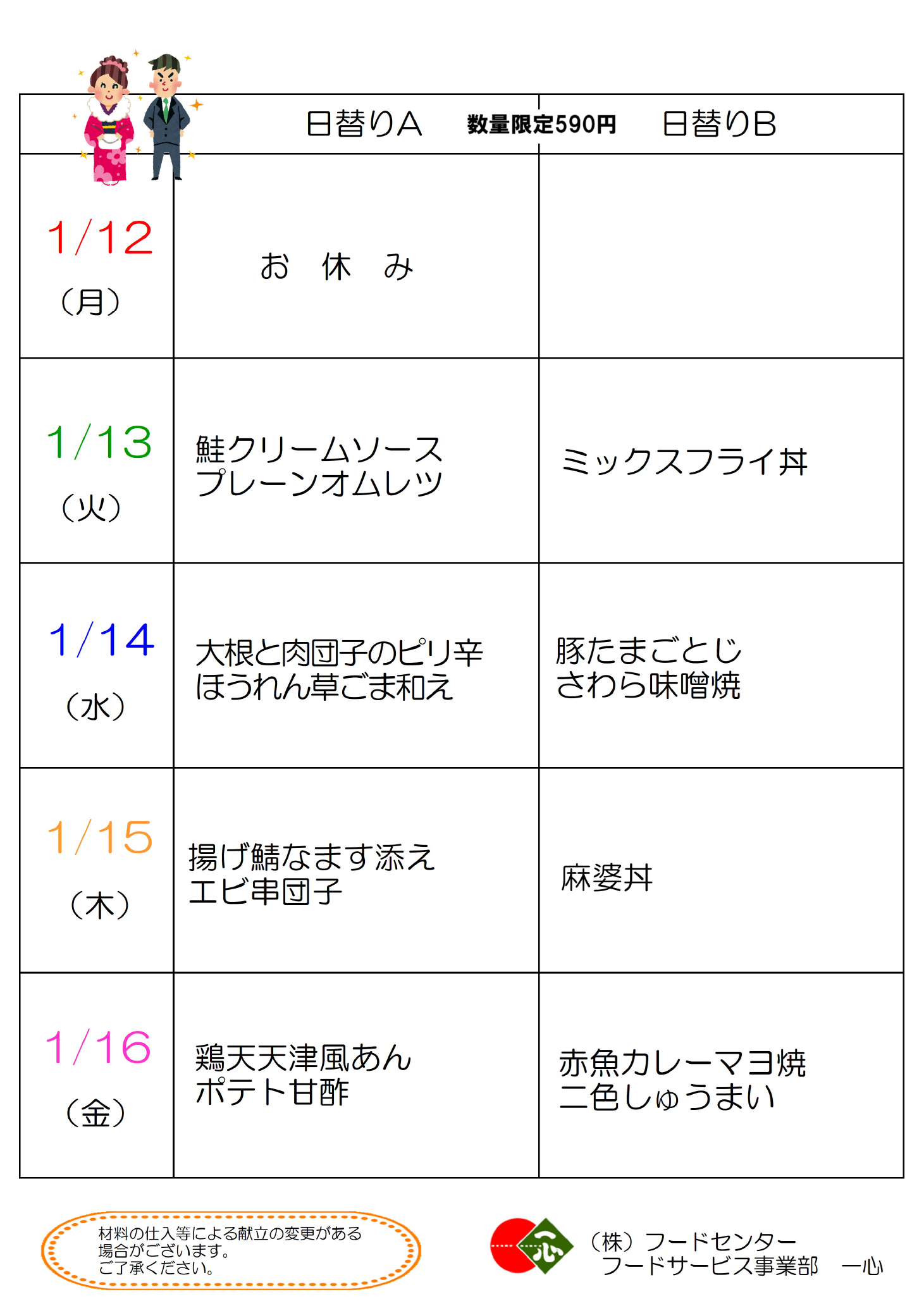 1月13日(火)~1月16日(金)日替わりランチA・Bメニュー