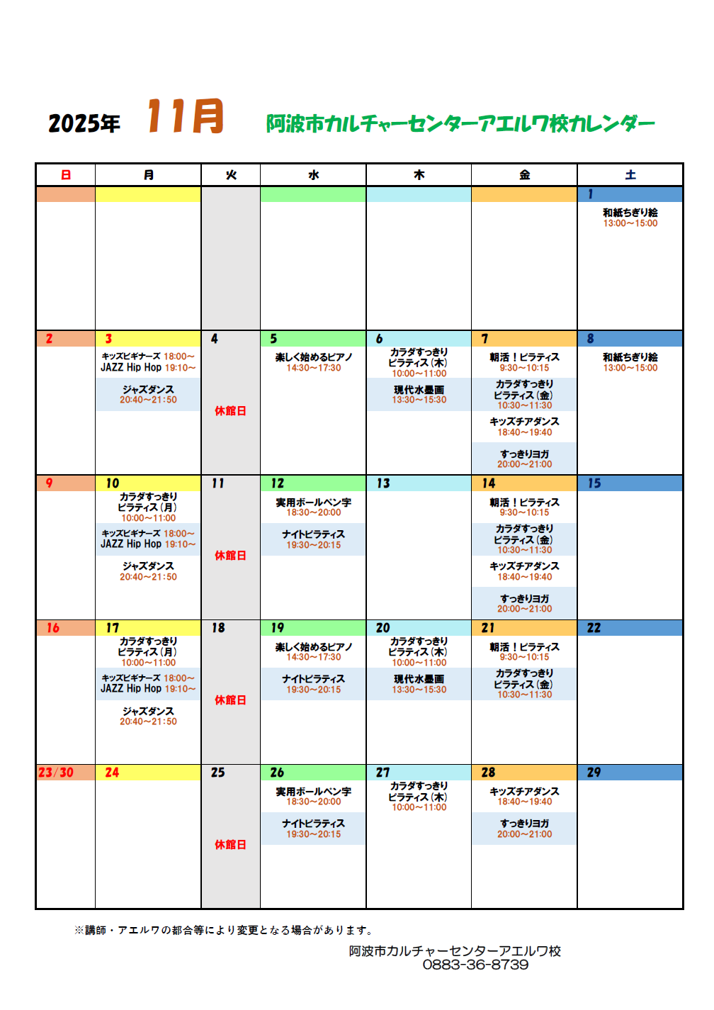 阿波市カルチャーセンターアエルワ校 予定表