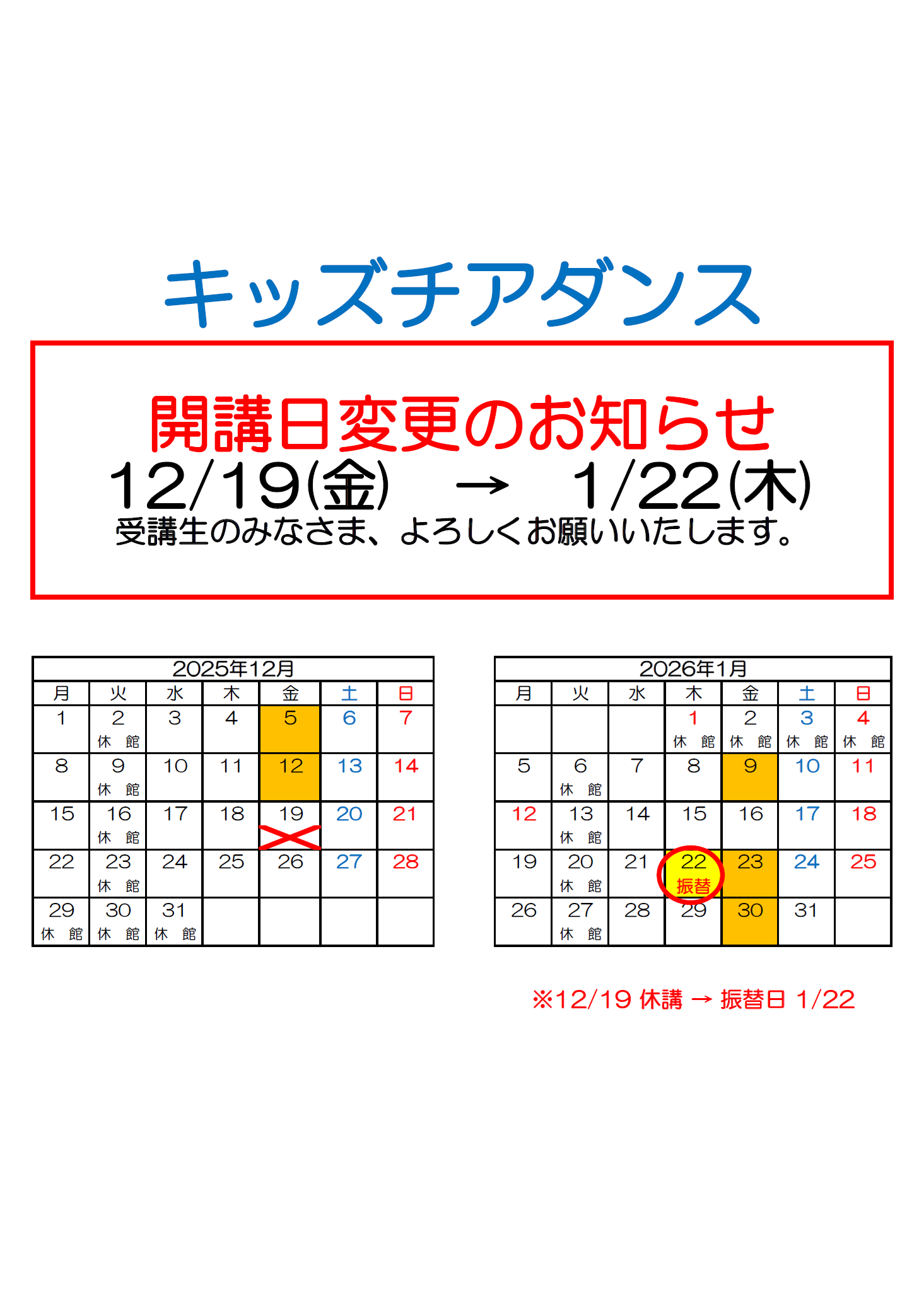 キッズチアダンス 開講日変更のお知らせ