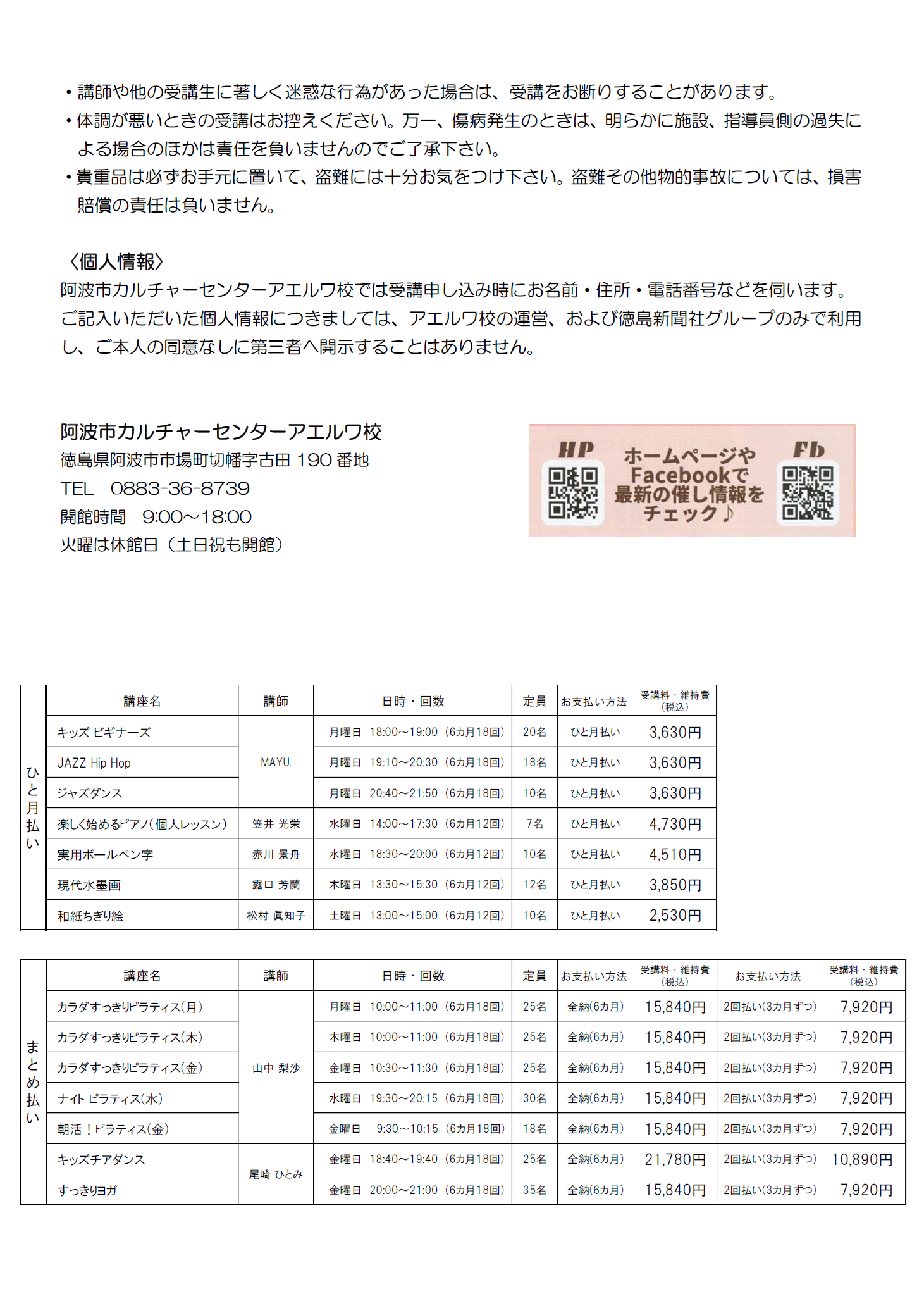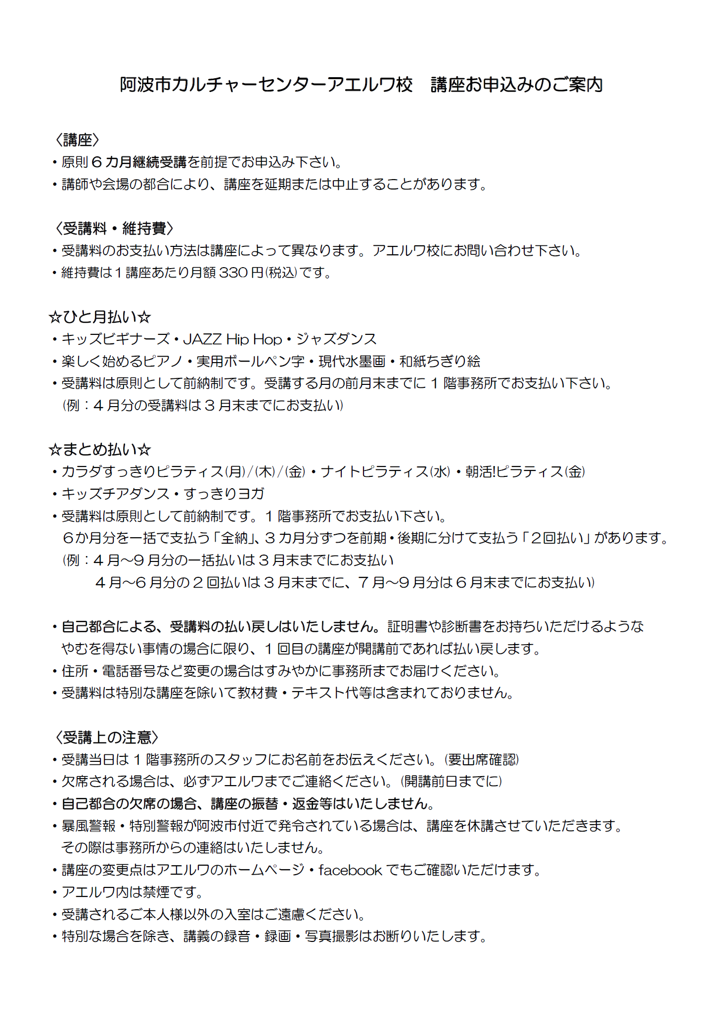 阿波市カルチャーセンターアエルワ校 講座お申込みのご案内